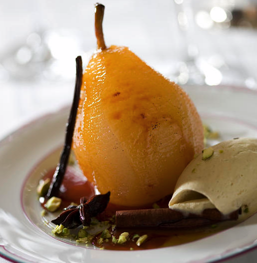 Груша, фаршированная шафраном, c мягким шоколадным пирожным в соусе какао