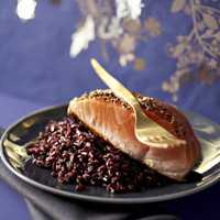 Эскалоп из лосося с соусом из черных оливок, вареным на пару луком-пореем и диким черным рисом
