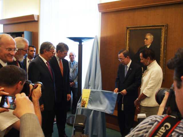 Вчера в библиотеке Европейского отделения ООН в Женеве состоялась инаугурация нового читального зала, который будет носить имя Джона Д. Рокфеллера младшего. Официальное название по-ооновски длинное: "Читальный зал архивов Лиги Наций и Объединенных Наций имени Джона Д. Рокфеллера мл.", но ясно, что уже через несколько дней все будут называть его просто "читалка Рокфеллера". На торжественной церемонии присутствовали Генеральный секретарь ООН Пак Ги Мун, находящийся в Швейцарии с официальным визитом, Генеральный директор Европейского отделения ООН Касым-Жомарт Токаев, Постоянный представитель США при Европейском офисе ООН Бетти Э. Кинг и наследник знаменитой династии Майкл Рокфеллер. Подробнее - в нашей статье, в сейчас несколько фотографий (© Nasha Gazeta.ch)