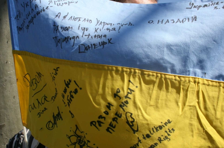 Собравшиеся рассказали Нашей Газете.ch, что они выступают против политики Владимира Путина, но не против русских. «Мир нашим народам», - гласила надпись на одном из двух плакатов, написанных на русском языке. Напомним: в это же время в женевском отеле Intercontinental проходила четырехсторонняя встреча с участием представителей России, Украины, ЕС и США.