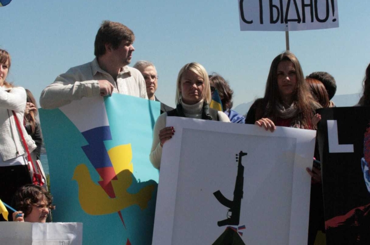 17 апреля напротив Дворца Вильсона в Женеве прошел митинг, организованный украинцами, живущими в Швейцарии. Предложение о проведении манифестации было распространено через социальные сети. По предварительным оценкам, перед зданием бывшей штаб-квартиры Лиги Наций собралось около 50 человек. Главное требование, выдвинутое участниками митинга, было озвучено на английском – «Stop Russian Aggression».