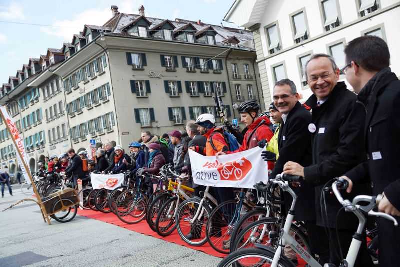 На площади Waisenhaus в Берне (в 350 метрах от Федерального дворца) сторонники инициативы расстелили красный ковер, по которому колесили около пятидесяти велосипедистов, призывавших к культурной революции. Точнее, призывали они к «велолюции» (что было написано на их агитационном плакате). Курьезность события в том, что велосипедисты выступили за свои права 5 марта – в день начала 85-го Международного автосалона в Женеве (который продлится до 15 марта).