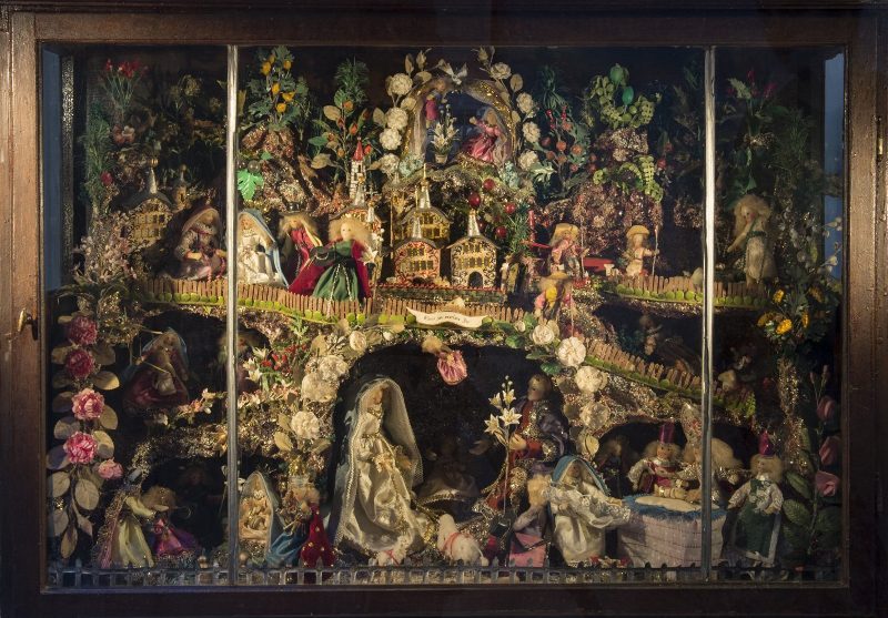 На выставке в Цюрихе представлены 24 вертепа, десять из них привезены из Музея искусства и истории Фрибурга, вместе с инструментами и образцами материалов, использованных при их изготовлении. Почти все фрибуржские экспонаты – творения католических монахинь (в том числе из цистерианского аббатства Мэгрож (кантон Фрибург), цистерианской обители сестер Сен-Жерве в Ромоне и церкви Святого Сердца Иисуса в Беллинцоне (кантон Тичино). Первоначально монастырские мастерицы делали вертепы и искусственные цветы только для украшения церквей, позднее их стали продавать. Вплоть до XIX века изготовление рождественских вертепов (которые называли «маленькими райскими обителями») играло важную роль в жизни швейцарских монастырей. Как правило, такие «обители» включали богато украшенные восковые фигуры, дома, цветы и помещались в специальный стеклянный ящик.