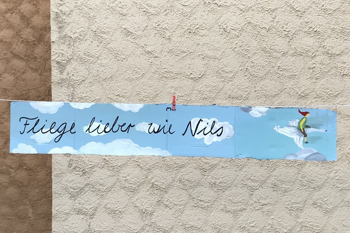 «Лучше летай, как Нильс» - этот и другие транспаранты с лозунгами экоактивистов на днях были развешены во дворе одной из бернских церквей в рамках акции в защиту климата. Фото: NashaGazeta