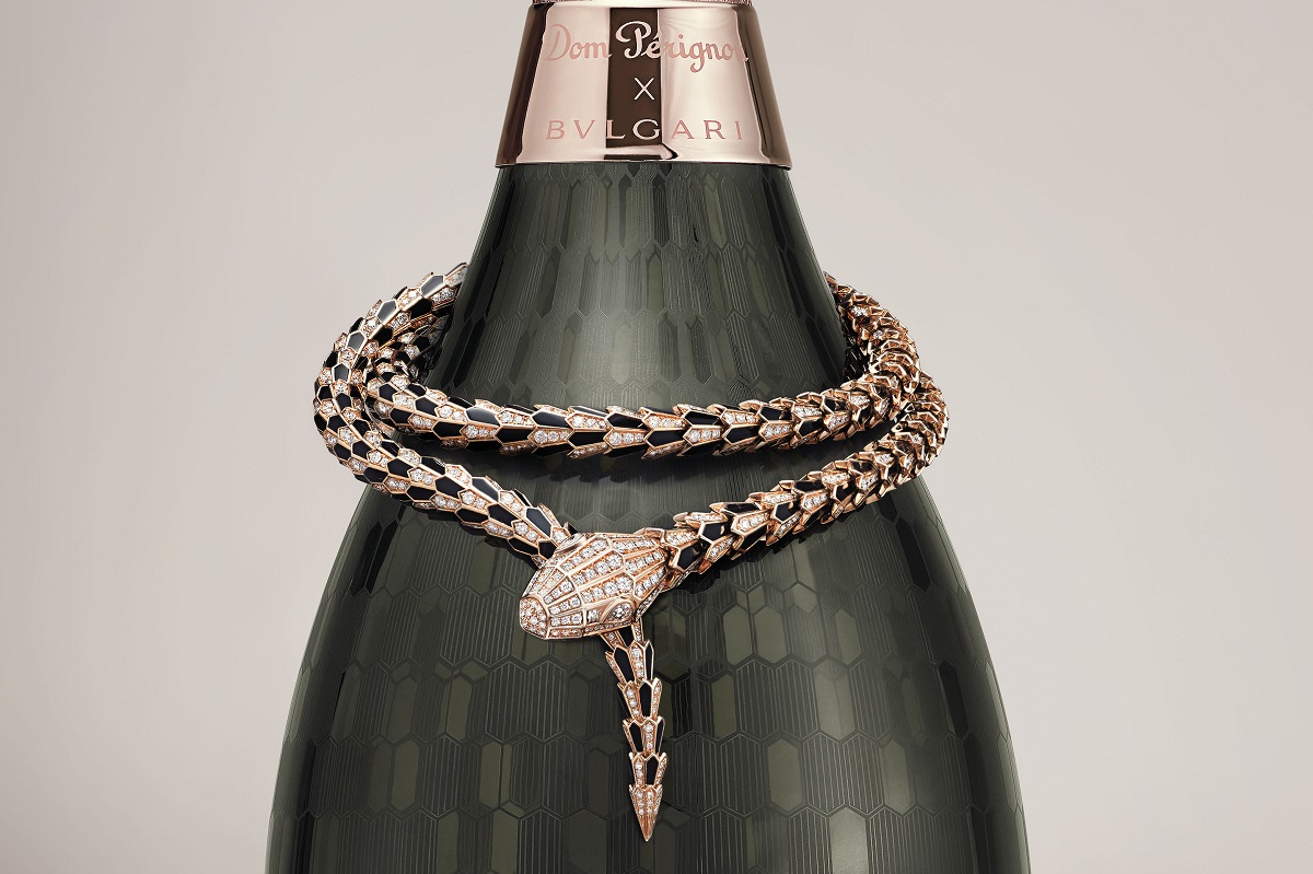 Результатом их сотрудничества стала лимитированная серия Bvlgari Serpenti x Dom Pérignon Rosé – колье из розового золота Bvlgari Serpenti и шампанское Dom Pérignon x Bvlgari Limited Edition Vintage Rosé 2004 в деревянном футляре в оттенках шафрана и насыщенной фуксии (фирменные цвета итальянского ювелирного дома).