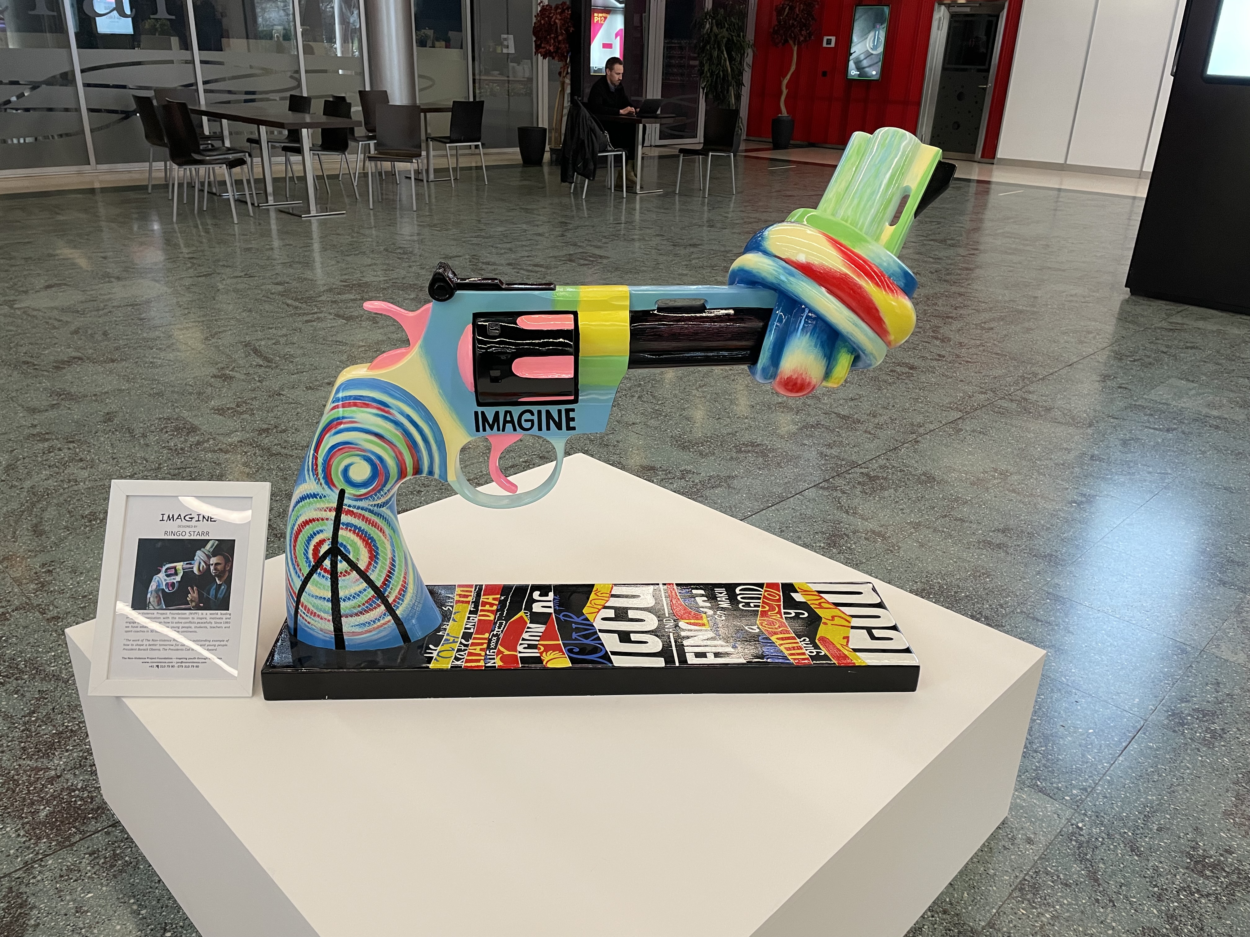 Речь идет о знаменитой скульптуре «Нет насилию» шведского скульптора Карла Фредрика Рейтерсварда, представляющей собой револьвер 45-го калибра с завязанным в узел стволом – пистолет находится во взведенном состоянии, но узел служит гарантией того, что он не выстрелит. Скульптура была создана художником в 1980 году, под впечатлением от известия о гибели его друга Джона Леннона. Опечаленный и возмущенный этой бессмысленной смертью, как и множеством других беспричинных вспышек насилия, Рейтерсвард отправился в свою мастерскую и приступил к работе. Копии скульптуры, а также вариации на ее тему с тех пор были установлены во многих странах, включая территорию комплекса ООН в Нью-Йорке. Согласитесь, трудно представить себе более мощный символ в контексте сегодняшней трагедии! Представив посетителям Palexpo одну из версий скульптуры, организаторы artgenève подчеркнули важность партнерства салона с Non-violence Foundation, продвигающей философию ненасилия через образовательные проекты. Обратите внимание, что автора дизайна этого пистолета с завязанным дулом не кто-нибудь, а сам Ринго Старр!