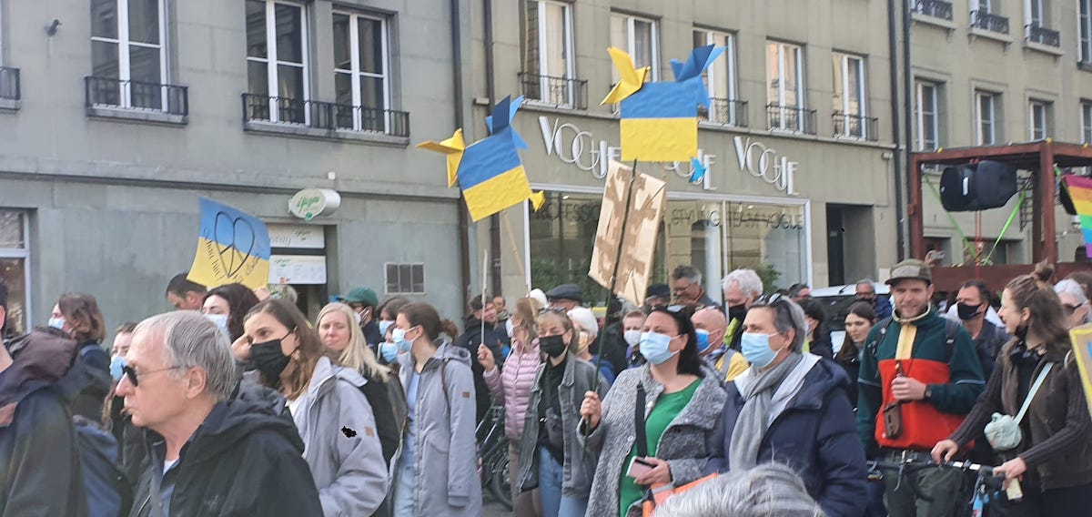 В субботу, 12 марта, в Берне несколько тысяч человек приняли участие в митинге за установление мира в Украине и за запрет импорта российского природного газа в Швейцарию. Протестующие прошли колонной от Schützenmatte до Федерального дворца. Многие несли в руках украинские флаги, радужные флаги мира, самодельных бумажных голубей и плакаты с критикой в адрес российского президента. Проведение акции было одобрено городскими властями. Нажмите на фото, чтобы увидеть его целиком. Фото – (с) Nashagazeta.ch; участники акции.