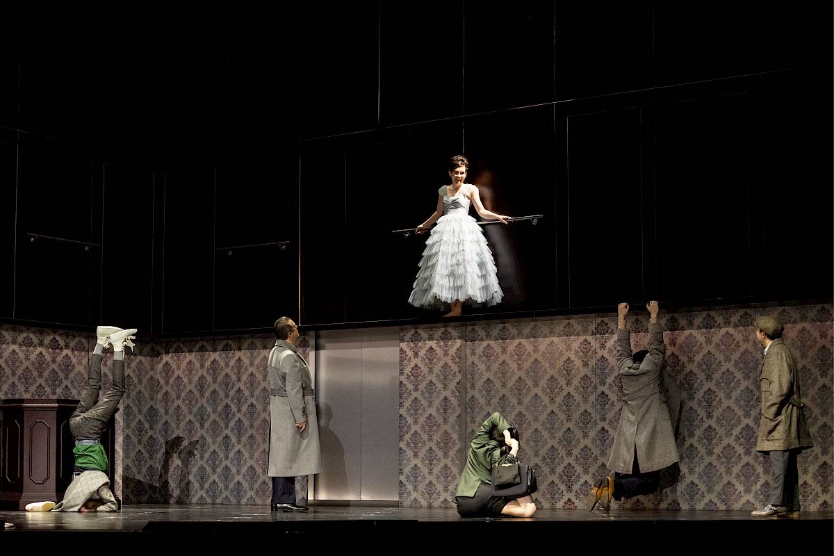 Редакция французского композитора предполагает не только пение на его родном языке, но и исполнение партии Орфея меццо-сопрано, так что появление на сцене украинской певицы Ольги Синякиной более чем оправдано. Компанию ей составляют две сопрано швейцарка Кьяра Скерат в партии Эвридики и француженка Алиса Дюпор-Персье в партии Амура. Помимо трех певиц Марталер включил в спектакль интернациональную актерскую команду этакие шесть персонажей в вечных поисках, они изображают то адских монстров, то офисных клерков, то услужливых официантов и соединяют сегодняшнюю повседневность с древним греческим мифом. Впрочем, как всегда у Марталера, сюжет про Орфея и Эвридику скорее повод для критики современности, чем обращение вглубь веков.