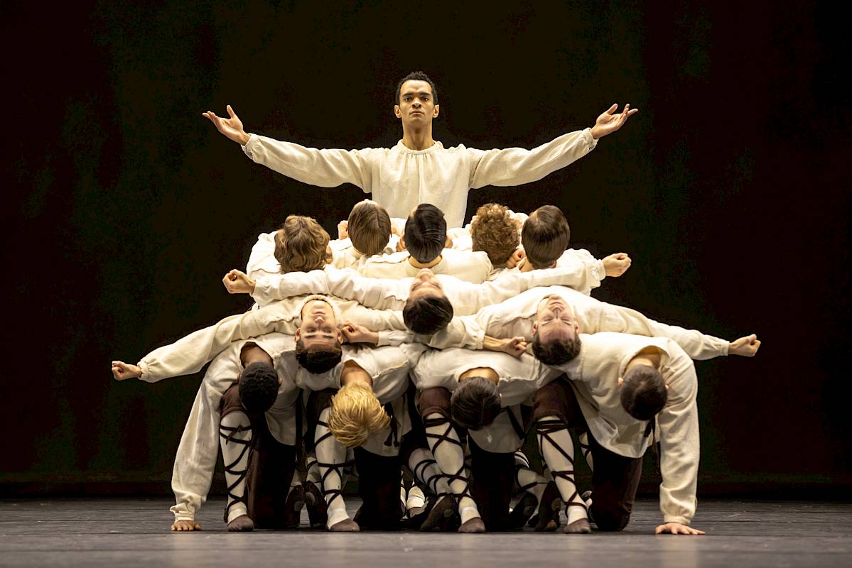 «Рапсодии» же Мтутузели Новембера на его собственную и Джорджа Гершвина музыку выглядели и вовсе беспомощно: происходившее на сцене сначала напоминало фигурное катание с не слишком осмысленными вращениями, а потом неожиданно превратилось в гимн небинарности и африканским корням хореографа. Прекрасная, лиричная и одновременно «взрывная» музыка Гершвина, исполненная вживую на двух фортепиано, диссонировала с вялыми движениями танцовщиков и их постоянными метаниями к заднику и за кулисы. А уж когда зазвучали современные техно-вставки самого Новембера, то на сцене и вовсе началась какая-то невнятная вакханалия с тряской и прыжками. Лично для меня (и, судя по реакции публики, не для меня одной) замысел хореографа так и остался загадкой.