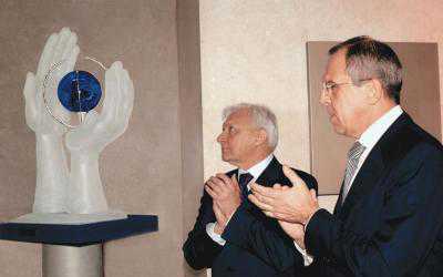 Министр иностранных дел РФ С.В. Лавров и постоянный представитель РФ в ООН (Женева) В.В. Лощинин рассматривают подарок.