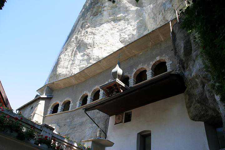 Колокольня скита, увенчанная золотой луковкой, напоминает лучшие традиции древнерусского зодчества (Википедия).