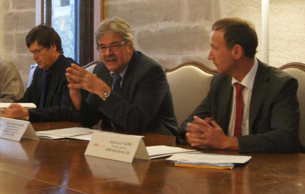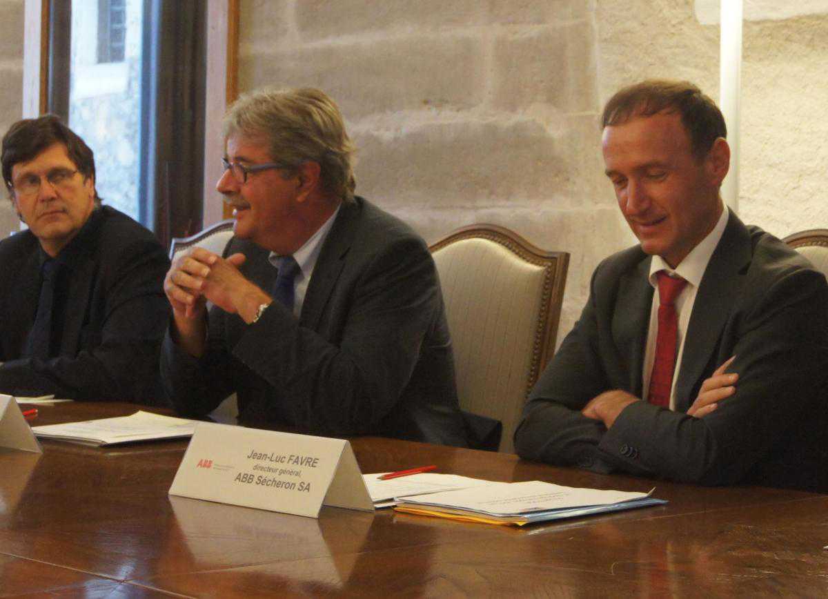 Слева направо: глава дирекции по экономическим вопросам кантона Женева Жан-Шарль Маньен, глава DARES Пьер-Франсуа Анже, гендиректор ABB Sécheron Жан-Люк Фавр (NashaGazeta.ch)