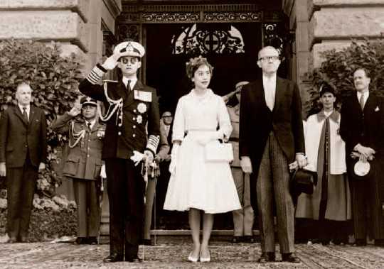 Визит короля и королевы Тайланда в Берн 29 августа 1962 года, на ступеньках Федерального Дворца с ними президент Швейцарской Конфедерации Макс Петипьер