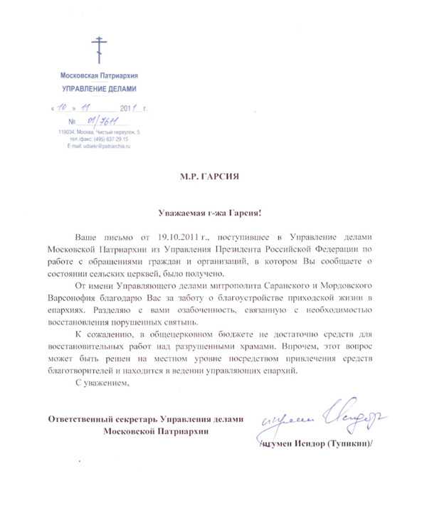 Письмо, полученное Марион Гарсия из Московской Патриархии