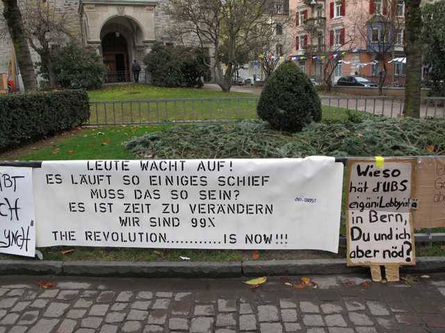 С Параденплатц революционерам-таки пришлось убраться. С середины ноября палаточный город разместился у кирхи Санкт-Якоба. Церковная община предоставила им убежище до 6 января будущего года. Отрадно сознавать, что церковь поддержала акцию. Несомненно, эта поддержка придаст популярности самой церкви, переживающей нынче в Швейцарии кризис. Демонстративный жест общины кирхи Санкт-Якоба показал, что хрупкий статус-кво между финансово-политической элитой и народом нарушен и, похоже, бесповоротно. А вот каким образом будет (или не будет) достигнут компромисс, покажет время.