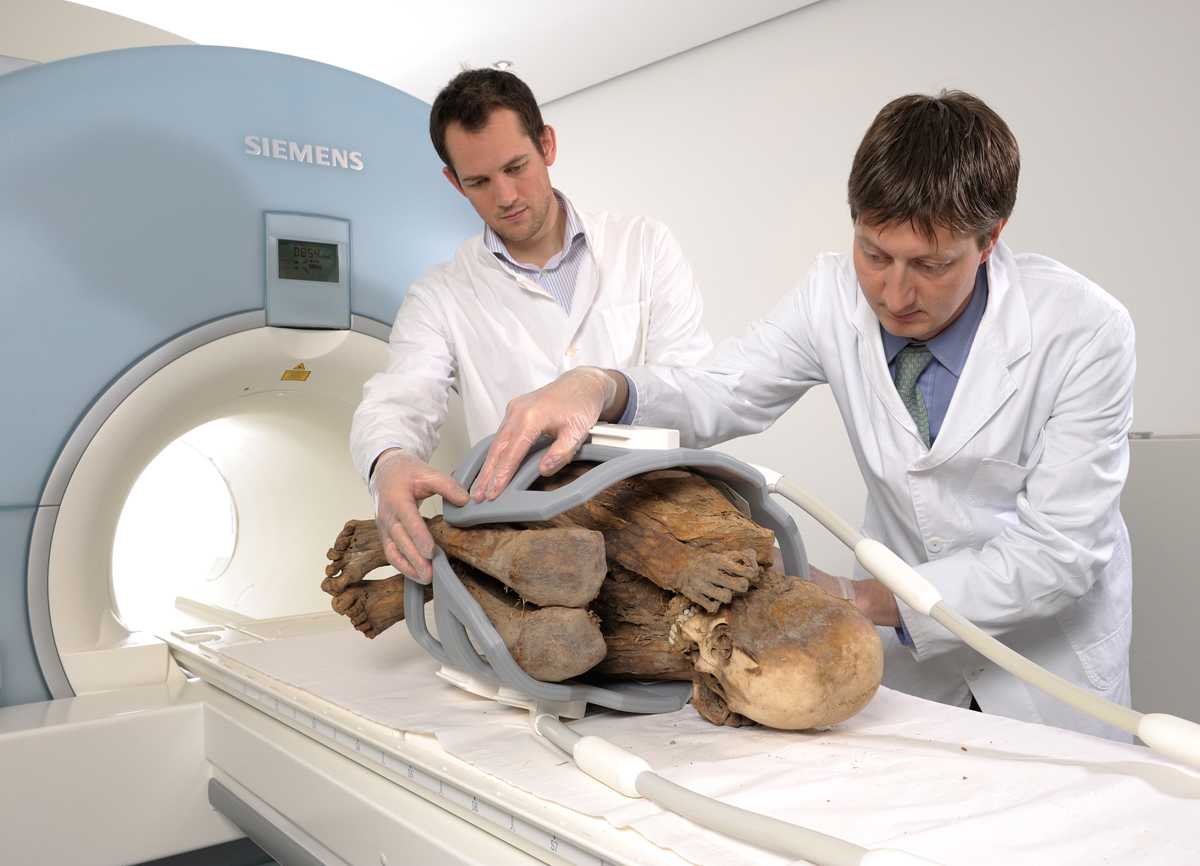 Сотрудники Центра эволюционной медицины Франк Рюли и Хендрик фон Вальдбург исследуют перуанскую сидящую мумию (Siemens-Pressebild)