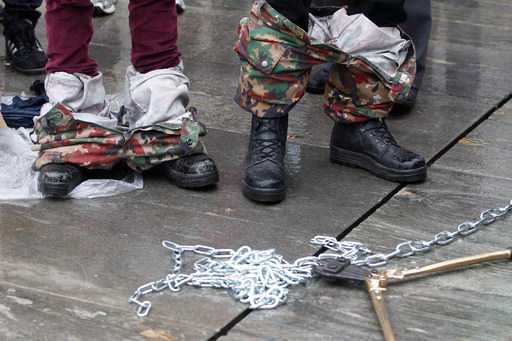 Площадь перед Федеральным Дворцом символических цепей сторонников добровольной службы освобождали гигантскими кусачками (© Keystone)