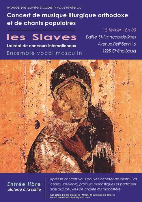 • в воскресенье, 12 февраля, в 18.00, в римо-католическом храме св. Франциска Сальского в Шен-Бурге в кантоне Женева (Eglise Saint-François-de-Sales, avenue Petit-Senn 16, 1225 Chêne-Bourg GE).