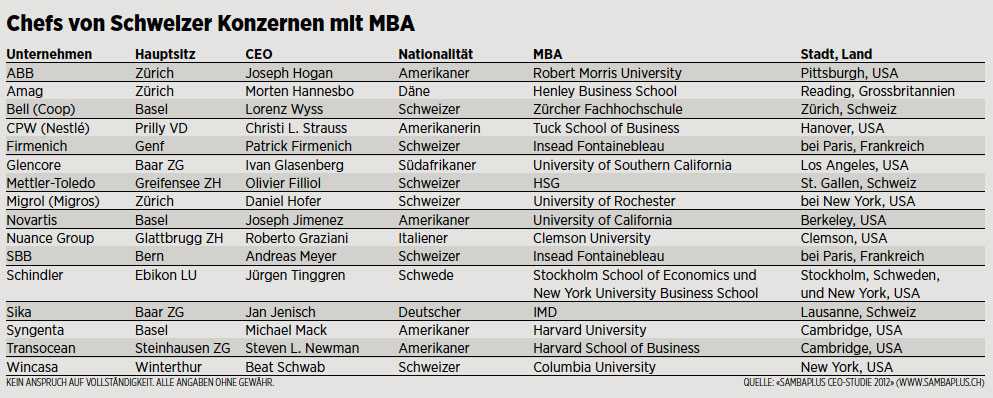 Большинство руководителей, у которых есть диплом MBA, учились в престижных школах за границей. В сотню швейцарских топ-менеджеров входят и несколько женщин, а единственная обладательница диплома MBA среди них – Кристи Штраус, глава Cereal Partners Worldwide, дочерней фирмы компании Nestlé. Она училась в Дартмунтском колледже в Нью-Гемпшире, где в 1902 году родилась система MBA. Но и выпускники таких «огранщиков бриллиантов», как парижский Insead, и лозаннская бизнес-школа IMD (Institute for Management Development) в списке достойно представлены.