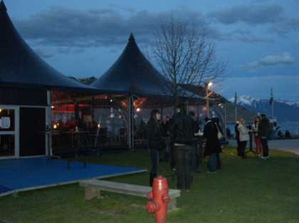 Мы сделали несколько «кругов почета» и только спустя  минут сорок нашли место для парковки. Солнце уже садилось, виноградники замерли в нежных лучах, которые отсвечивали от белоснежных вершин. Концерт на всех площадках начинался в 21-00, и мы успели минута в минуту. Промчавшись по побережью между огромных тентов, в которых расположились рестораны и две основные сцены, мы скользнули в переулочки старинного городка.