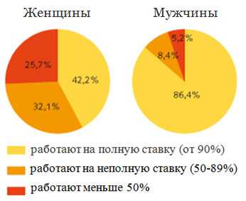 Показательно, что и женщины, у которых нет семьи и детей, тоже чаще работают на неполную ставку, чем мужчины при аналогичных условиях. При этом число работающих женщин все увеличивается (76,7% в прошлом году), хотя оно пока ниже, чем работающих мужчин (88,7%).