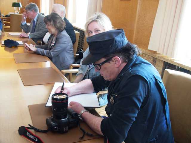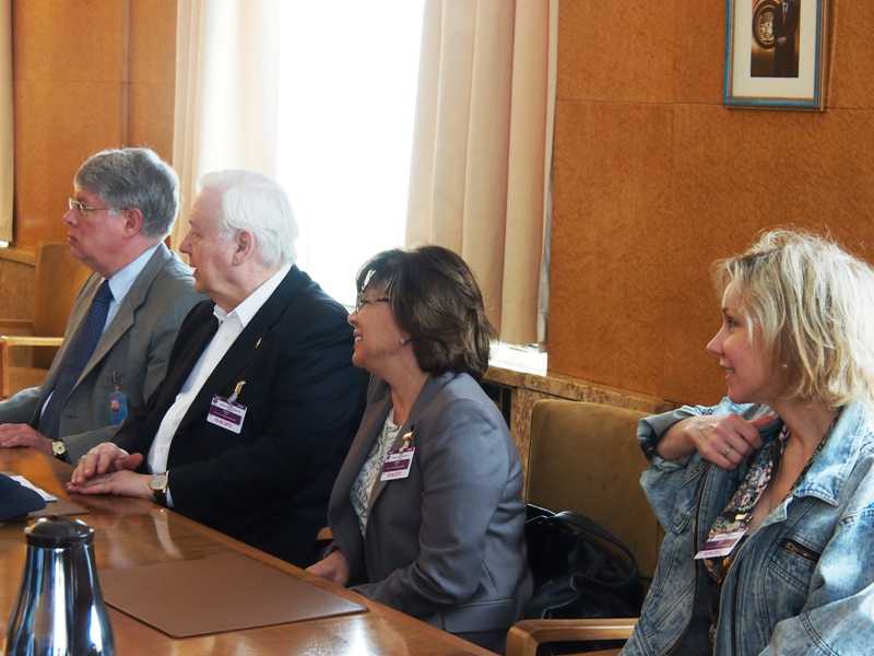 Затем гостям была предложена небольшая экскурсия по кулуарам Дворца наций – вы можете пройти по их стопам, если заглянете в нашу фотогалерею. Большой интерес вызвал у них «Испанский зал», где проходят заседания Исполнительного совета Организации. Олег Табаков даже примерился к роли представителя Португалии (российскую табличку сразу не нашли), но быстро заскучал.