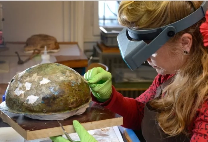 Это еще очень хрупкий экспонат. Он был отлит из бронзы, не имел плюмажа, сзади находится назатыльник, а с боков – отверстия для подбородных ремней.