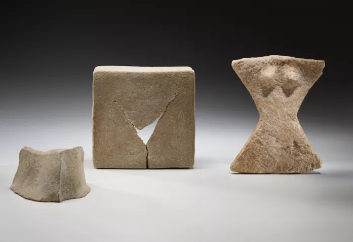 Пунукская фигурка с Аляски и две статуэтки с Киклад, архипелага в южной части Эгейского моря, из собрания Барбье-Мюллера беседуют с «Пупком» Жака Кауфмана (2021). Musée Barbier-Mueller, photo Luis Lourenço.