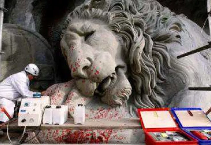 А недавно какие-то вандалы облили «Умирающего льва» стойкой красной краской. Что не уменьшило его грустного шарма! А возмутительный непорядок  срочно должен был быть устранен силами муниципалитета. На фото специалист Витус Вей проводит очистительные работы с помощью специальной аппаратуры.