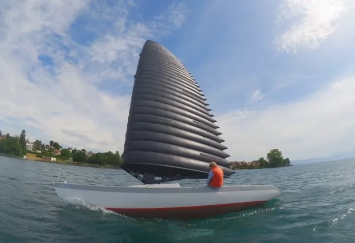 На судне длиной 9 метров парус-крыло надувается и сдувается за несколько минут. Тех, кто наблюдает за швейцарским изобретением с берега, впечатляет вырастающий на глазах 11-метровый парус, благодаря которому уменьшается угол наклона корабля, а его хозяевам нужно прилагать гораздо меньше усилий во время маневров.