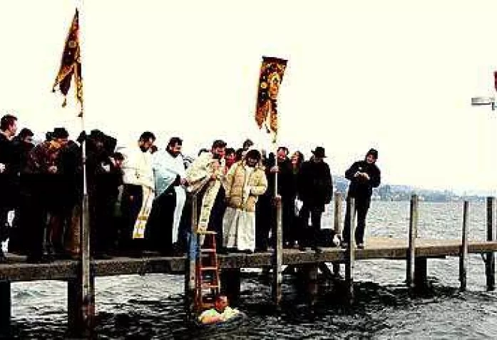 Крещенские купания традиционно ассоциируются с морозом и прорубью, однако, 18 января в Цюрихе было +3, дул пронизывающий ветер и временами принимался дождь. Чтобы служить молебен, а уж тем более окунаться в стылую воду при такой погоде, нужно, пожалуй, даже больше силы духа, чем на сибирском морозе.