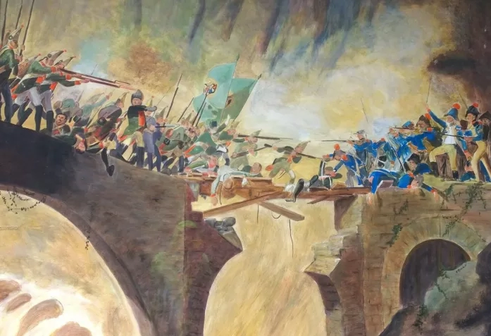 Валун и ныне тут, украшенный гербом Швейцарии и флажком кантона Ури. А вот мост, конечно, перестраивался неоднократно. Тот мост, по которому шли суворовские войска, был построен в 1595 году: шириной 2.3 м., без перил, под ним – несколько десятков метров пустоты и ревущий горный поток. А теперь еще представьте, что одна из секций моста была разрушена французами и весь он простреливается. Офицерскими шарфами укрепляли солдаты мост, чтобы пройти по нему правда, потом не забывая эти шарфы забрать обратно: была промозглая осень.