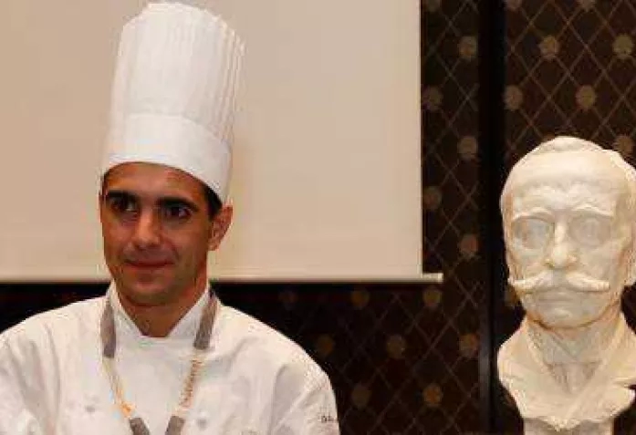 Жуан Гомез Вара с бюстом великого учителя Огюста Эскоффье (© Eric Voyame)