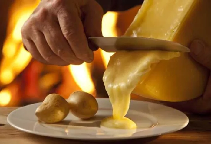 Раклет – не просто традиционное блюдо валезанской кухни, но и отличная праздничная трапеза для большой компании. Половины сырной головы, похожей на месяц, хватает в среднем на 9 человек. Рассаживаются обычно за большим столом на террасе или в специальной комнате (во всех альпийских ресторанах есть сырная комната) в особом порядке. Варёная в мундире картошка (про альпийскую картошку – отдельная история) в завёрнутой по-деревенски корзинке, сохраняющей тепло, несколько бутылок местного белого вина Фондан (для детей кока-кола для лучшего переваривания жирного горячего кушанья или горячий альпийский чай), банка солёных корнишонов с луковками (внутри банки - хитроумная шумовка, чтобы не мочить пальцы), перечная мельница и пара керосиновых ламп (в Альпах нередко встречаются хижины без электричества) создают законченную сервировку стола.