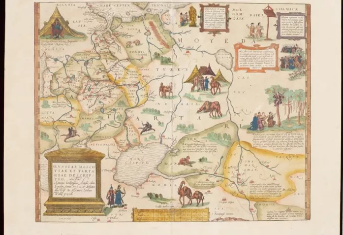 Что касается оттисков, условно изображающих территорию современной России, упомянем карту «Тартария, или страна великого Хама» (лат. «Tartariae sive magni Chami regni typus»). Эта карта – часть географического атласа земного шара нового типа под названием «Зрелище круга земного» (лат. «Theatrum Orbis Terrarum»). Автор труда, фламандский ученый-картограф Абрахам Ортелий (1527-1598) создал 70 карт и сопроводил их статьями страноведческого характера. Издателем этого труда, целиком и по частям, стал другой яркий представитель фламандского Ренессанса Христофор Плантен (1520-1589). Его типография «Officina Plantiniana» в середине XVI в. была ведущей в Европе.