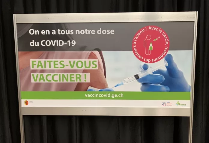 "У каждого из нас есть доза коронавируса. Вакцинируйтесь!" - гласит плакат в женевском Palexpo (c) NashaGazeta