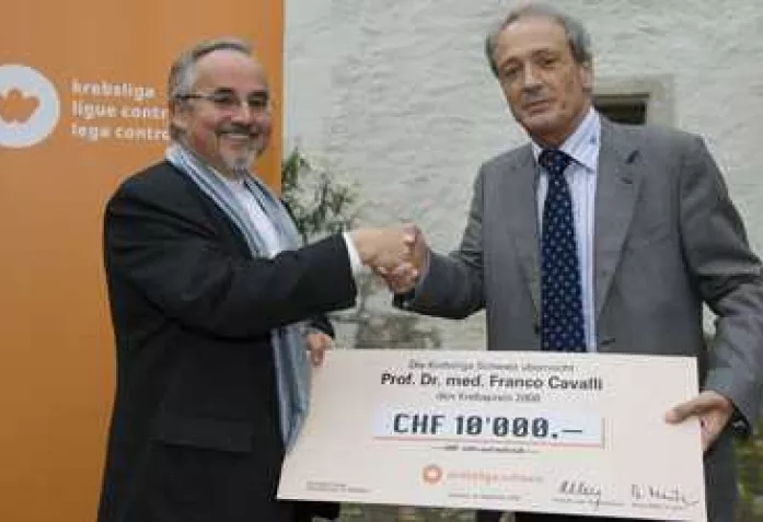 Ну, а главный приз в размере 10 000 франков достался известному исследователю в области раковых заболеваний профессору Франко Кавалли, кантон Тичино. На снимке его поздравляет президент Лиги профессор Томас Черни.