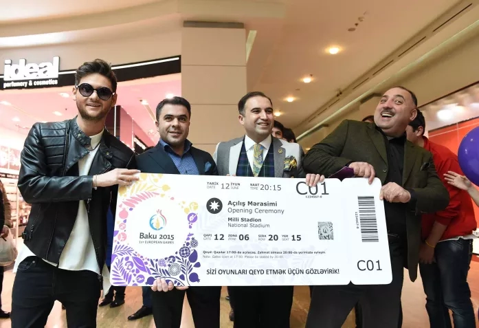 В торжественном открытии первой специальной «билетной точки» приняли участие несколько послов Баку 2015 – актер Жабир Иманов, победитель конкурса Евровидение Эльдар Гасимов, комик Бахрам Багирзаде, телеведущий Нуран Гусейнов. Гостям было предложено два часа развлечений, а также возможность сфотографироваться с гигантским билетом и с официальными символами соревнований - газелью по имени Джейран и мальчиком-гранатом Наром.