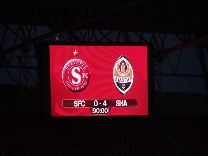 Украинский олигарх Ринат Ахметов может быть доволен – принадлежащий ему футбольный клуб, ведущий свою историю с 1936 года, не подвел своего владельца. Особенно отличился капитан команды бразилец Фердинаньо, забивший два из четырех голов. Блестящая игра команды, объединяющей игроков разных национальностей и цветов кожи, не оставила равнодушной болельщиков. Которых, увы, собралось не много – из 30 тысяч мест новенького женевского стадиона Stade de Genève заполнено было чуть больше тысячи.  Видимо, основная масса любителей футбола предпочла все же остаться дома и посмотреть по телевизору предпоследний матч Чемпионата Европы. И напрасно, ведь ощущения, которые испытываешь, сидя на трибуне, с «домашними» не сравнить.