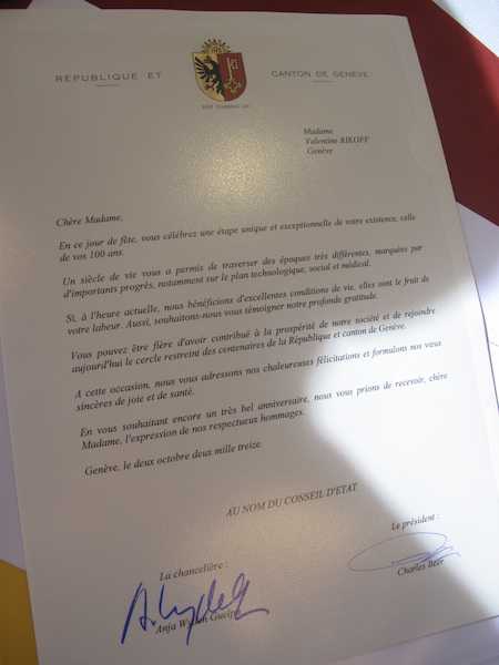 2 октября Женева отмечала сотый день рождения старейшей русскоязычной жительницы кантона - Валентина Ивановны Рыковой. Рассказ об этом удивительном празднике вы найдете здесь, а вот несколько фотографий, не поместившихся в статью. (Все фото - Nashagazeta.ch и Владимир Агрономов)
