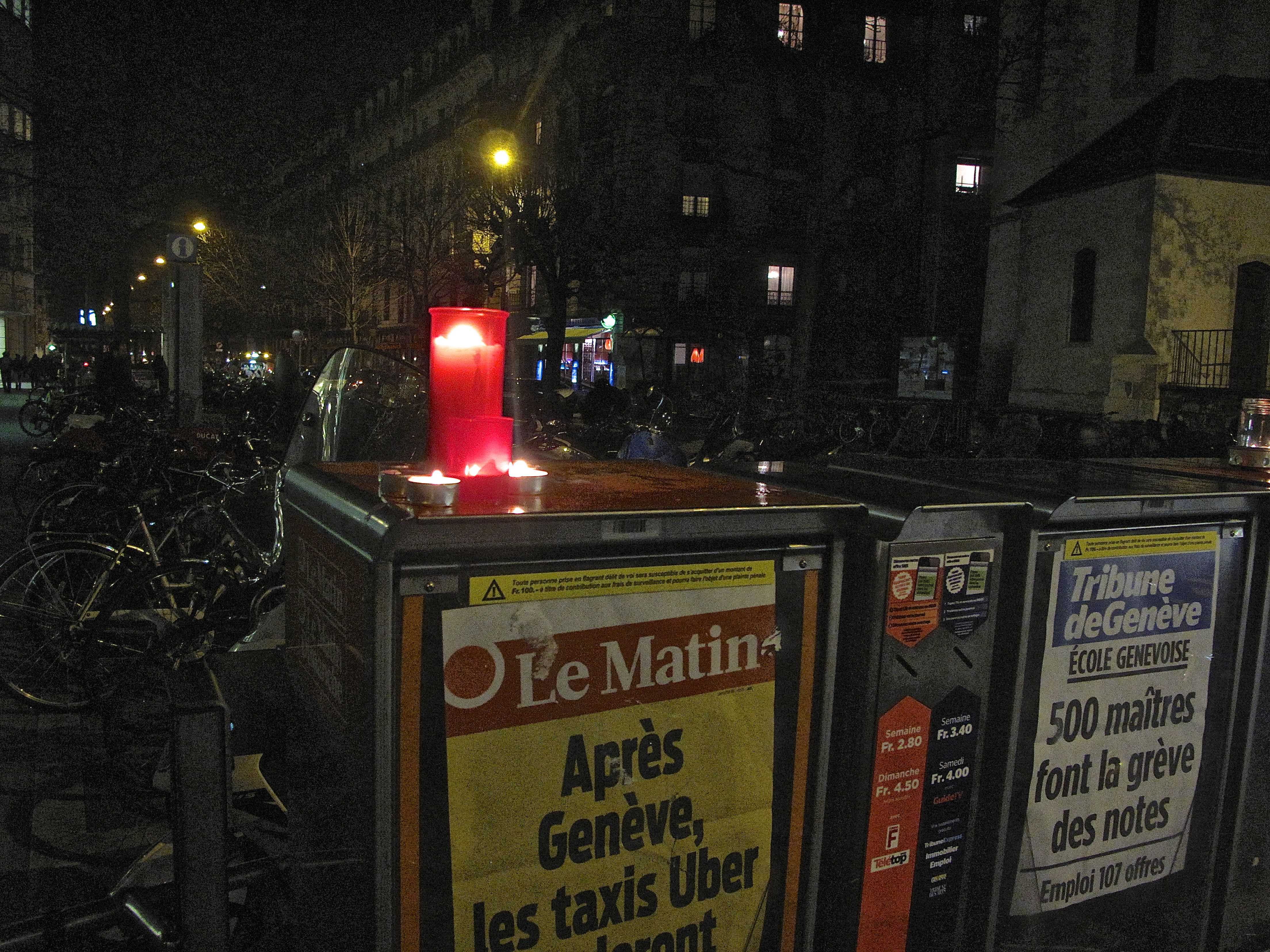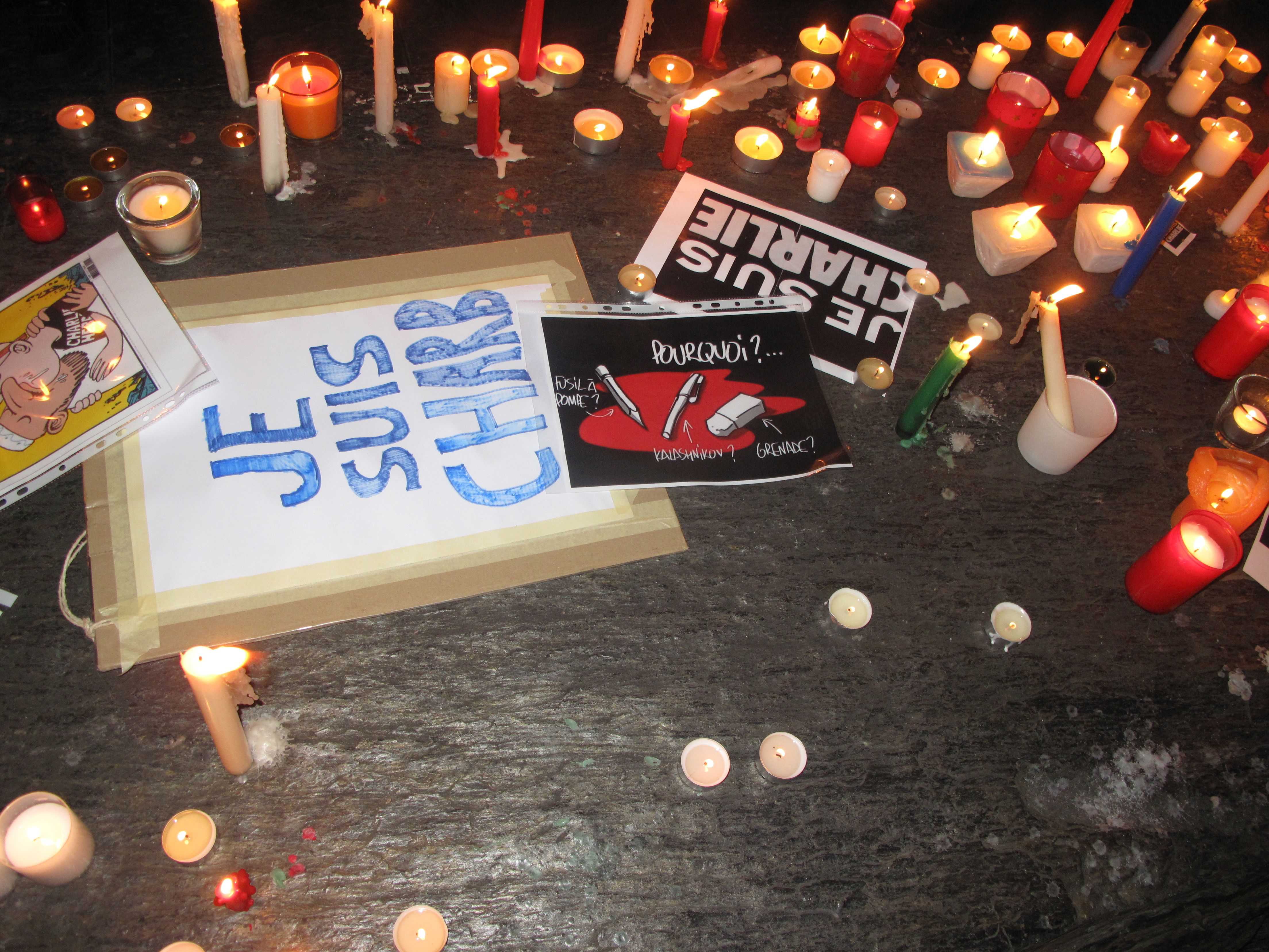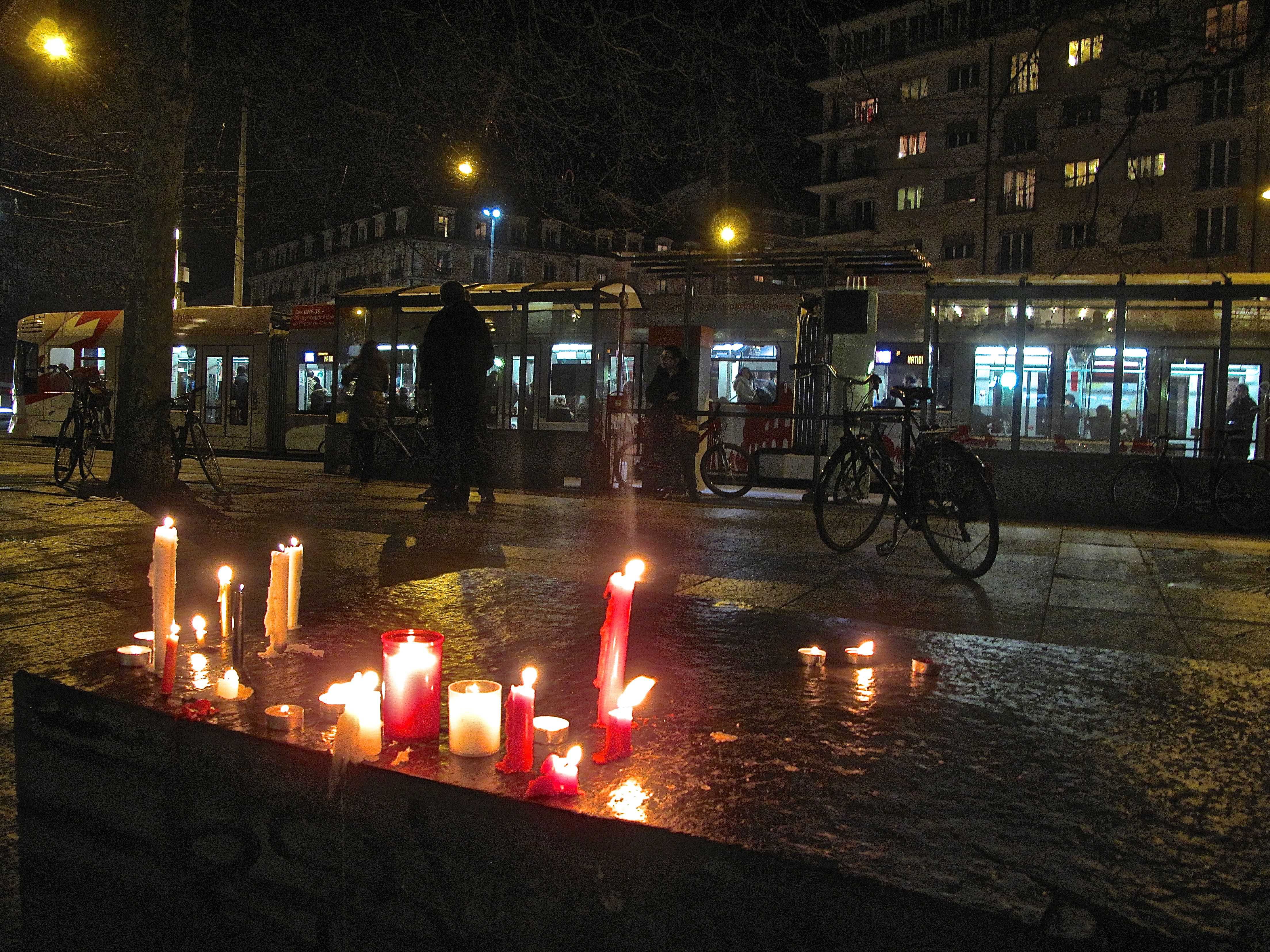 Вечером на площадь перед Женевским университетом вышли сотни жителей города. Они почтили память погибших и выразили поддержку Charlie Hebdo. Многие держали в руках свечи, плакаты со словами «Je suis Charlie» («Я – Шарли») и приносили карандаши – основной рабочий инструмент погибших карикатуристов.