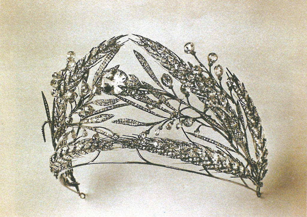 Невозможно закончить рассказ о семействе Дювалей, не упомянув хотя бы некоторые шедевры, созданные этим ювелирным домом. Мы уже писали о Большой императорской короне, которую Яков Дюваль создал вместе с Позье, о Малой императорской короне Елизаветы, жены Александра I, о перстне, подаренном Павлом I Суворову, и о браслете для Елизаветы, изготовленном по заказу Марии Федоровны. А вот еще несколько наиболее значительных работ швейцарцев. Франсуа Дюваль создал для вдовствующей императрицы Марии Федоровны уникальную по красоте и оригинальности исполнения диадему, известную как «Русское поле». Она получила такое название, поскольку на тонком обруче крепились золотистые колосья, наполненные алмазными «зернами». Императрица была в восторге от диадемы и называла ее «моя диадема из колосьев». Этот шедевр после смерти Марии Федоровны стал частью русских коронных вещей. Венец, созданный, скорее всего, в 1808 году, вдохновлял не одно поколение ювелиров. Оригинал же был продан за бесценок в 1927 году на лондонском аукционе Кристис, и где он сейчас, неизвестно.