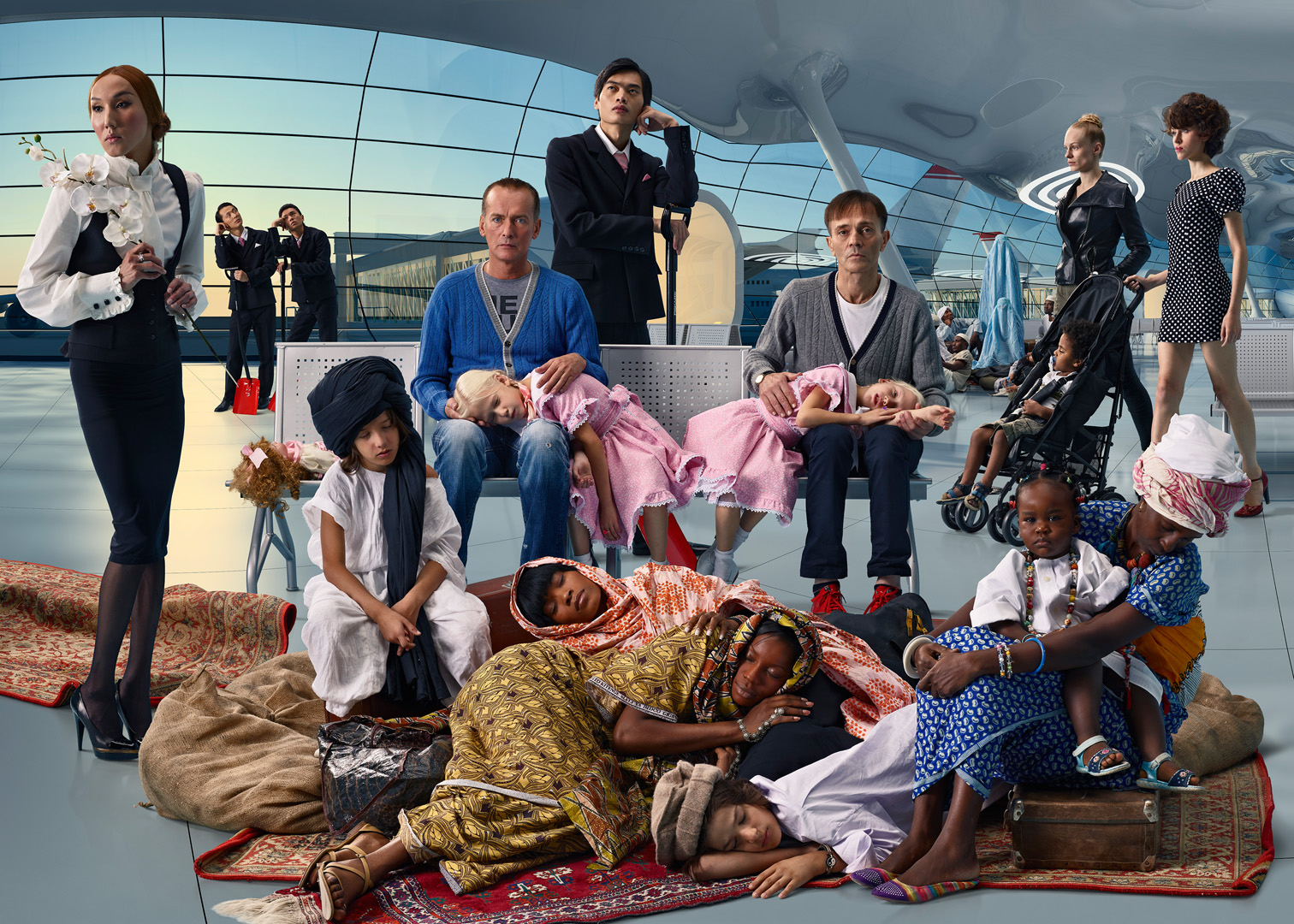 Проект «Священная Аллегория / Allegoria Sacra» напрямую связан с одноименной картиной Джованни Беллини (1490–1500), которой можно полюбоваться во флорентийской Галерее Уффици. Вот уже шесть столетий обыватели и специалисты спорят о том, что за аллегория на ней изображена. Никто точно не знает, что за Аллегория представлена на полотне из Уффици. Большинство исследователей полагает, что на полотне изображено Чистилище, расположенное на берегу реки Стикс, где души умерших ожидают решения Высшего суда о своей дальнейшей судьбе. Преображенная бурной фантазией участников AES+F, их Allegoria — тоже Чистилище, но изображенное в современной технике, и вместо ренессансной мраморной лоджии местом действия выступает … аэропорт. А вот герои «перемешались», поэтому Иов, святая Екатерина, кентавры, ангелы сосуществуют со стюардессами в форме, с таинственными людьми в черных костюмах, с респектабельными пожилыми дамами, рабочими на коньках. Все это – под музыку Генделя. Удивительно, что и старые, и новые лица – совершенно узнаваемы, мы встречаем их в видеоиграх и в глянцевых журналах.