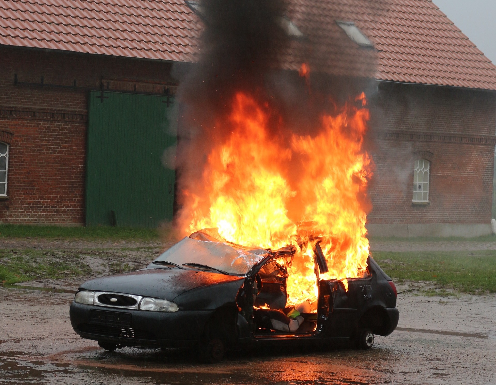 Если машина загорелась, нужно как можно скорее остановиться, заглушить мотор и включить аварийные огни. После этого отойти от авто на безопасное расстояние и вызвать пожарных. До их приезда можно постараться погасить огонь самостоятельно при помощи огнетушителя. При этом следует становиться с наветренной стороны на расстоянии струи от очага пожара.