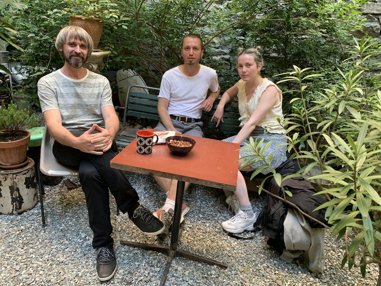 Но каково же было наше удивление, когда навигатор привел нас на парковку в довольно сомнительном женевском районе, прямо за вокзалом, к зданию сарайного типа à la сельский дом культуры, украшенному вывеской компании по производству вентиляционных и охладительных систем (явно не существующей), а также нецензурными надписями. Рояля в кустах не наблюдалось. Зато наблюдался симпатичный внутренний дворик с разномастной публикой, мирно попивающей кто чай, кто пиво. А на втором этаже готовился к выступлению Сергей Филатов, снующий между странными предметами, напоминающими гонги. Они и были инструментами, на которых держался перформанс – выставка и концерт, подобных которым доселе видеть нам не доводилось. Любопытство взыграло, и уже через два дня мы сидели в уютном дворике Дуплекса со всеми тремя российскими «артистами-в-резиденции» и выясняли подробности для предлагаемого вашему вниманию тройного портрета. Начали с Сергея Филатова.