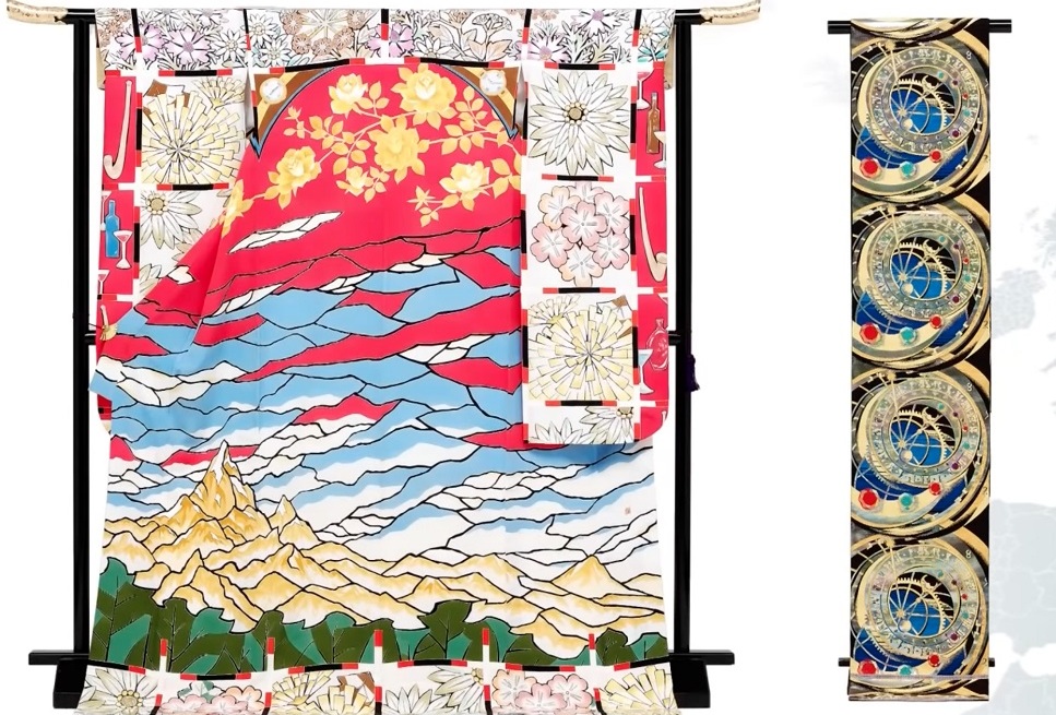 На швейцарском кимоно можно разглядеть Альпы, на вершинах которых отражаются лучи заходящего солнца. При росписи ткани активно использовались красно-белые цвета швейцарского флага. При ближайшем рассмотрении по бокам кимоно можно увидеть такие символы Конфедерации, как альпийский рог и … вино, вероятно, из виноградников Вале. Пояс оби представляет собой отдельное произведение искусства и воспроизводит точный дизайн циферблата башенных часов с помощью передовой техники ручного ткачества.