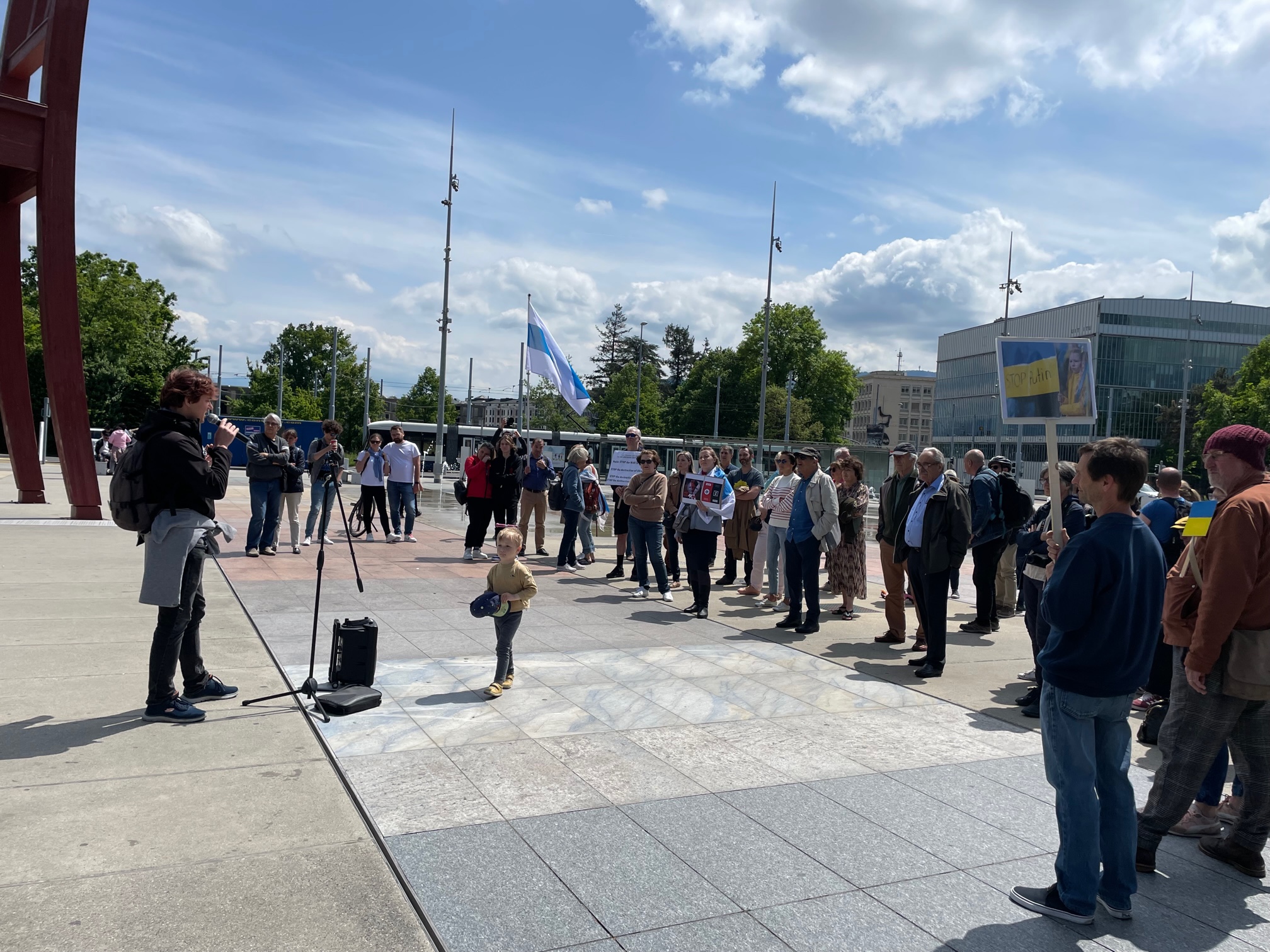 Несмотря на выходной день и идеальные погодные условия народу под бело-сине-белым флагом, используемым участниками протестов против вторжения России на Украину в России и за рубежом, было мало. Возмутительно мало. Зато говорили пришедшие русские, украинцы, швейцарцы о многом. О попранном и преданном общем героическом прошлом, о необходимости экономической блокады официальной России и помощи русским дезертирам и диссидентам, об отравленных пропагандой умах, о необходимости не молчать. Слушали «Червону калину». Кто-то плакал.