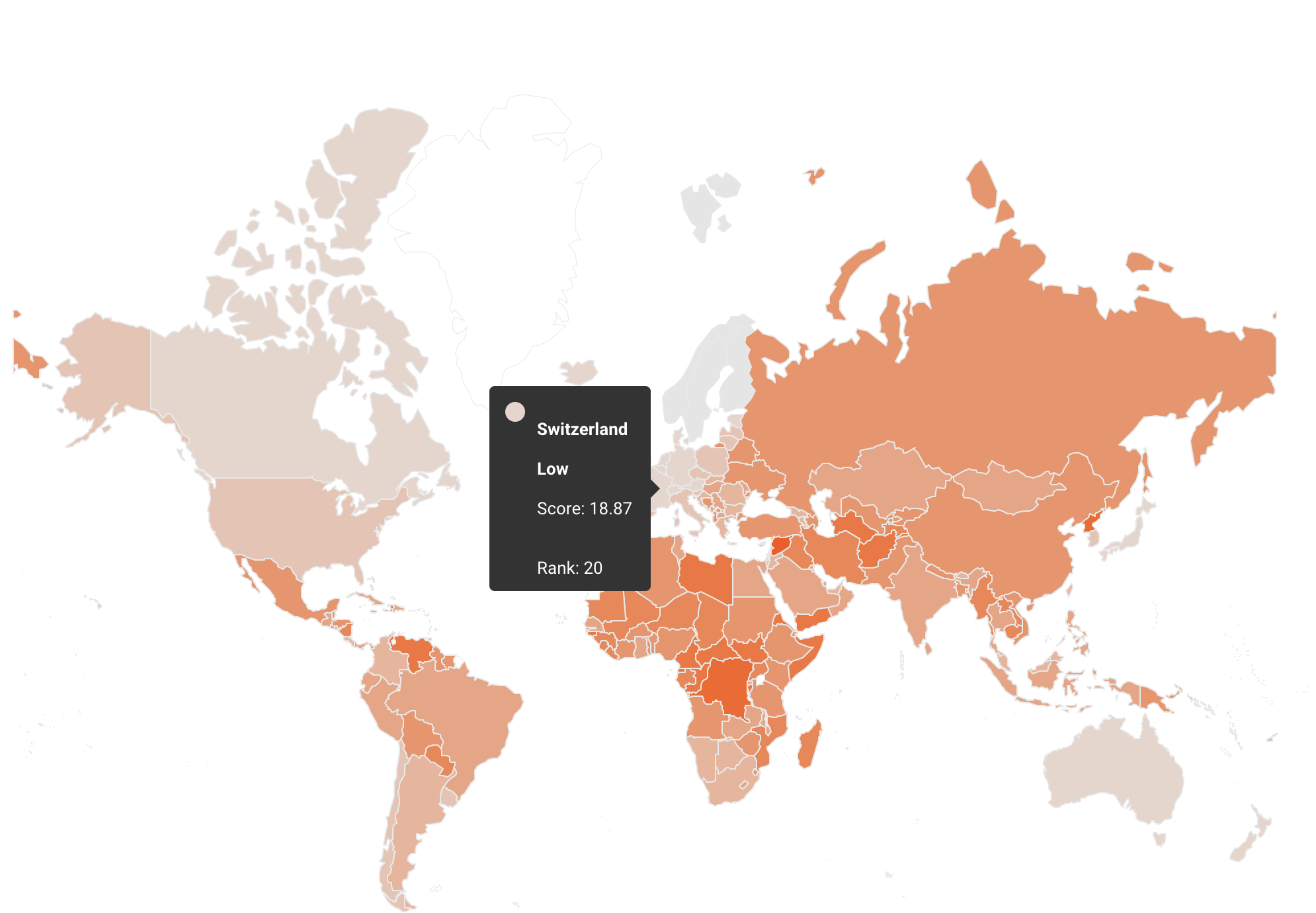 Женевская компания Global Risk Profile (GPR) – лидер в области «экономического разума», то есть наблюдения за соблюдением этики и разумной осторожности при ведении бизнеса и с учетом вопросов охраны окружающей среды и социальных аспектов. Выпускаемый ею Глобальный индекс коррупции (The Global Corruption Index, GCI) охватывает 196 стран, он составляется на основе 42 признанных критериев и включает в себя данные двух под-индексов, известных как «Коррупция» и «Беловоротничковые преступления». Стоит уточнить, что вторая категория касается экономических преступлений и преступных махинаций, таких как отмывание денег, мошенничество, финансирование терроризма и т.д. Страны расположены в индексе по школе от 0 до 100, где 0 соответствует самому низкому риску, а 100 самому высокому.
