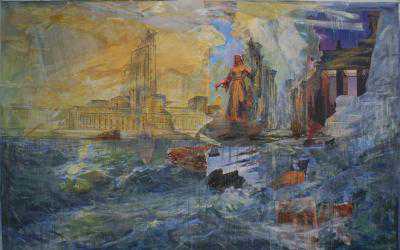 А внутри очень интересно. Полотна Валерия Кошлякова, которого специалисты называют одним из важнейших художников его поколения, поражают своей монументальностью – и по размеру, и по содержанию, некоей «архитектурностью» композиции, в которой прошлое соседствует с современностью, и почти физически осязаемой ностальгией.